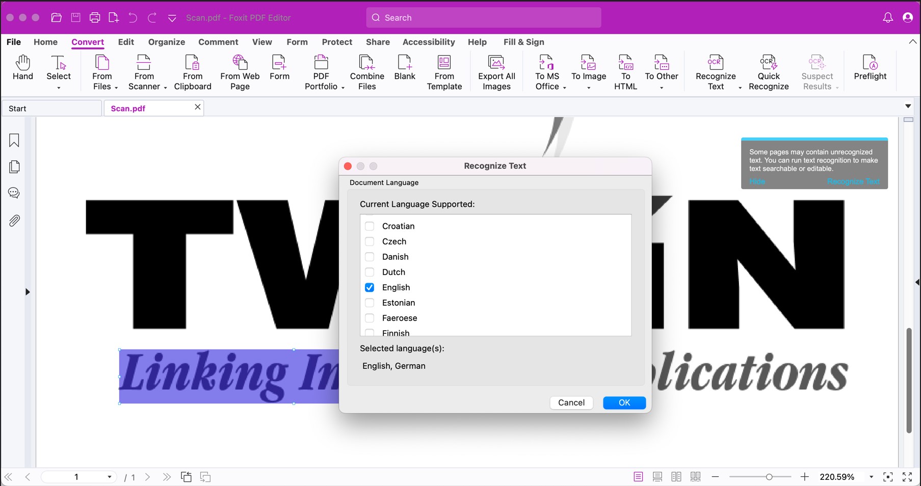 - In the pop-up dialog box, choose the language(s) used in your document, and click OK to start recognition.