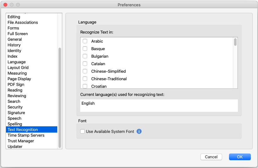 - Choose File in the Ribbon (or Foxit PDF Editor in the menu bar) > Preferences > Text Recognition.